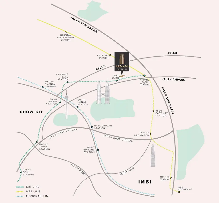 Armani Prestige is situated on Jalan Mayang, across from The Petronas Towers, offering an exceptional five-star experience just steps away from The Avenue-K and Suria KLCC Mall. Enjoying close proximity to urban amenities, Armani Prestige also provides a serene retreat away from it all.